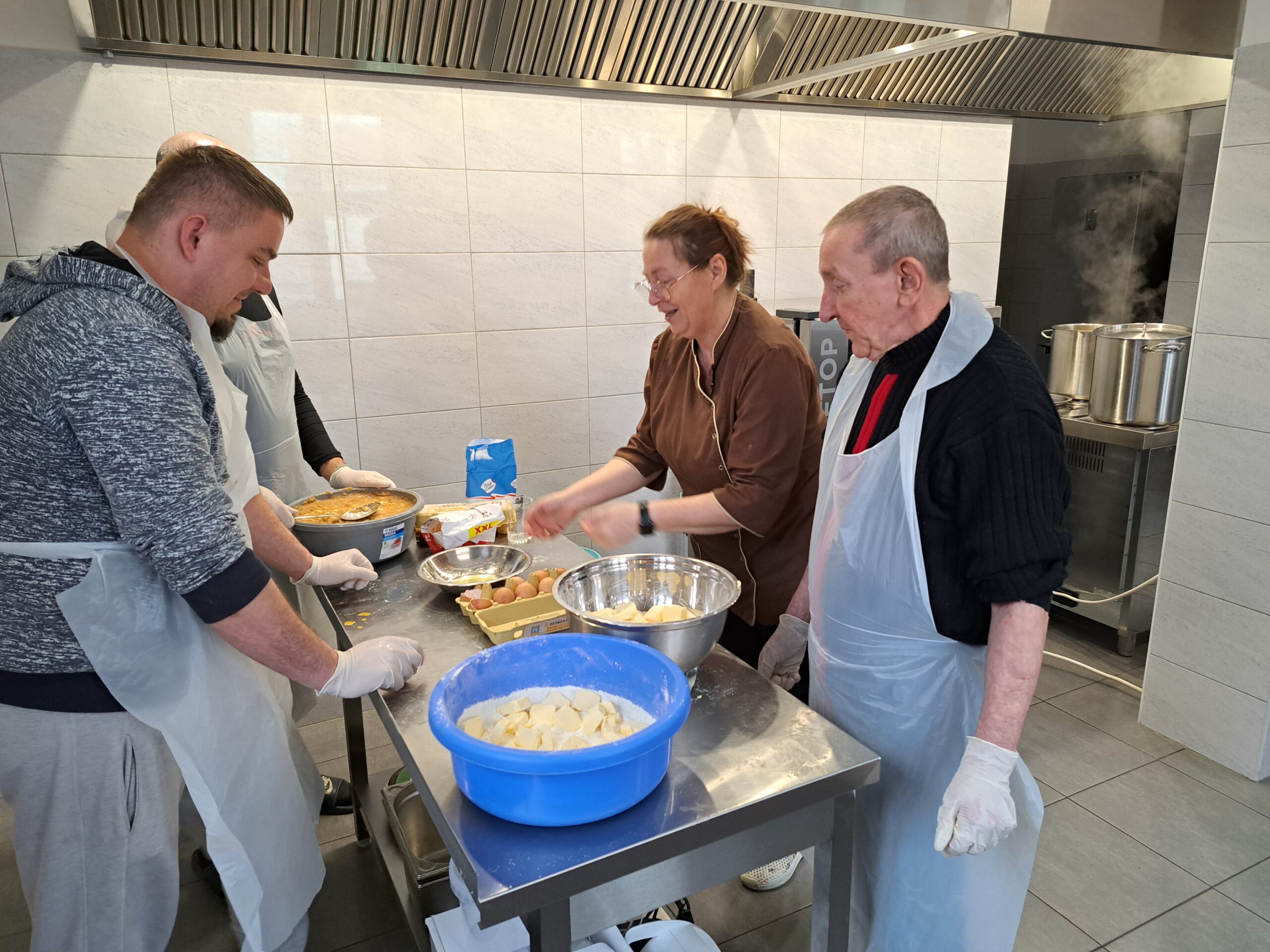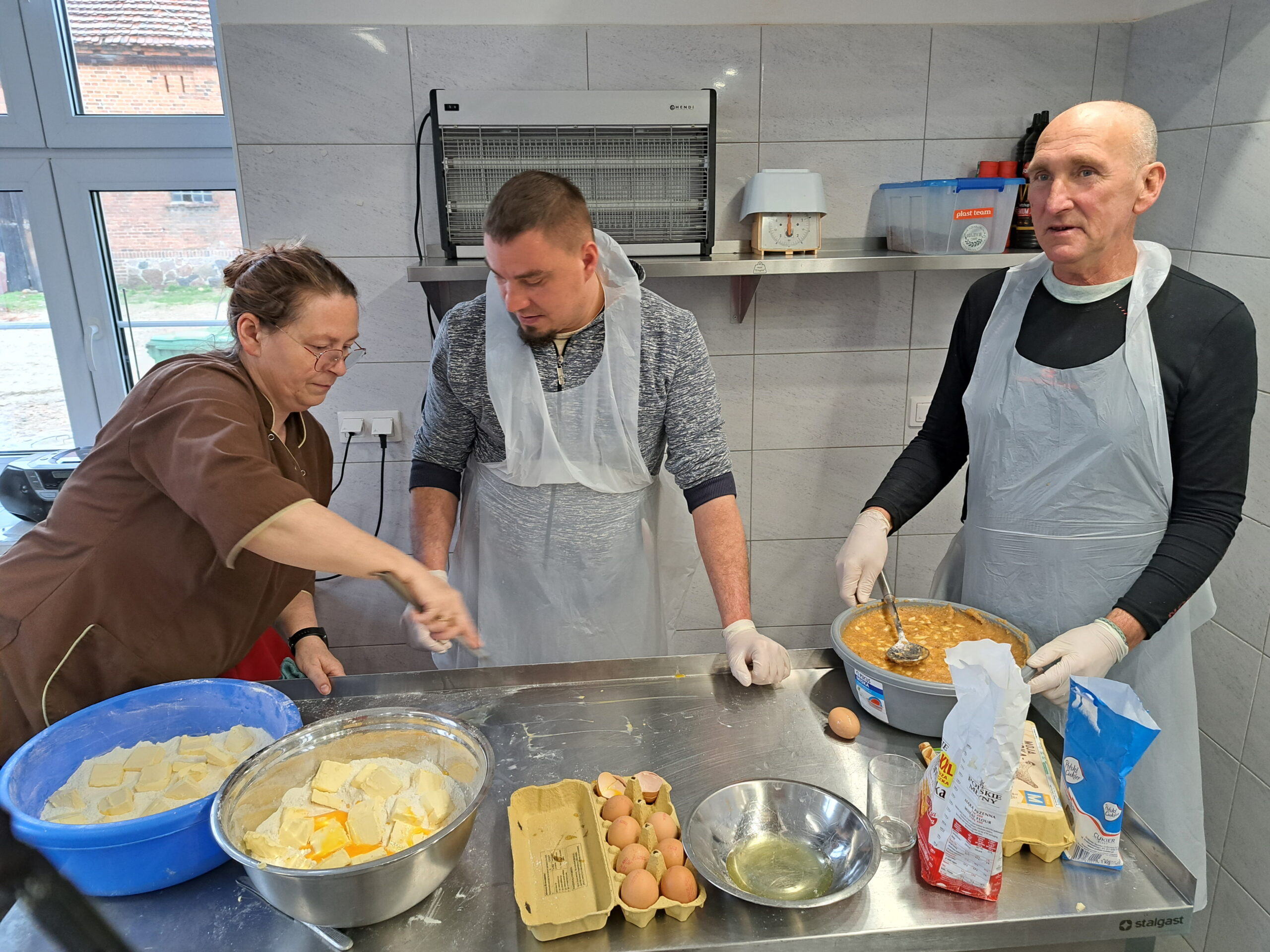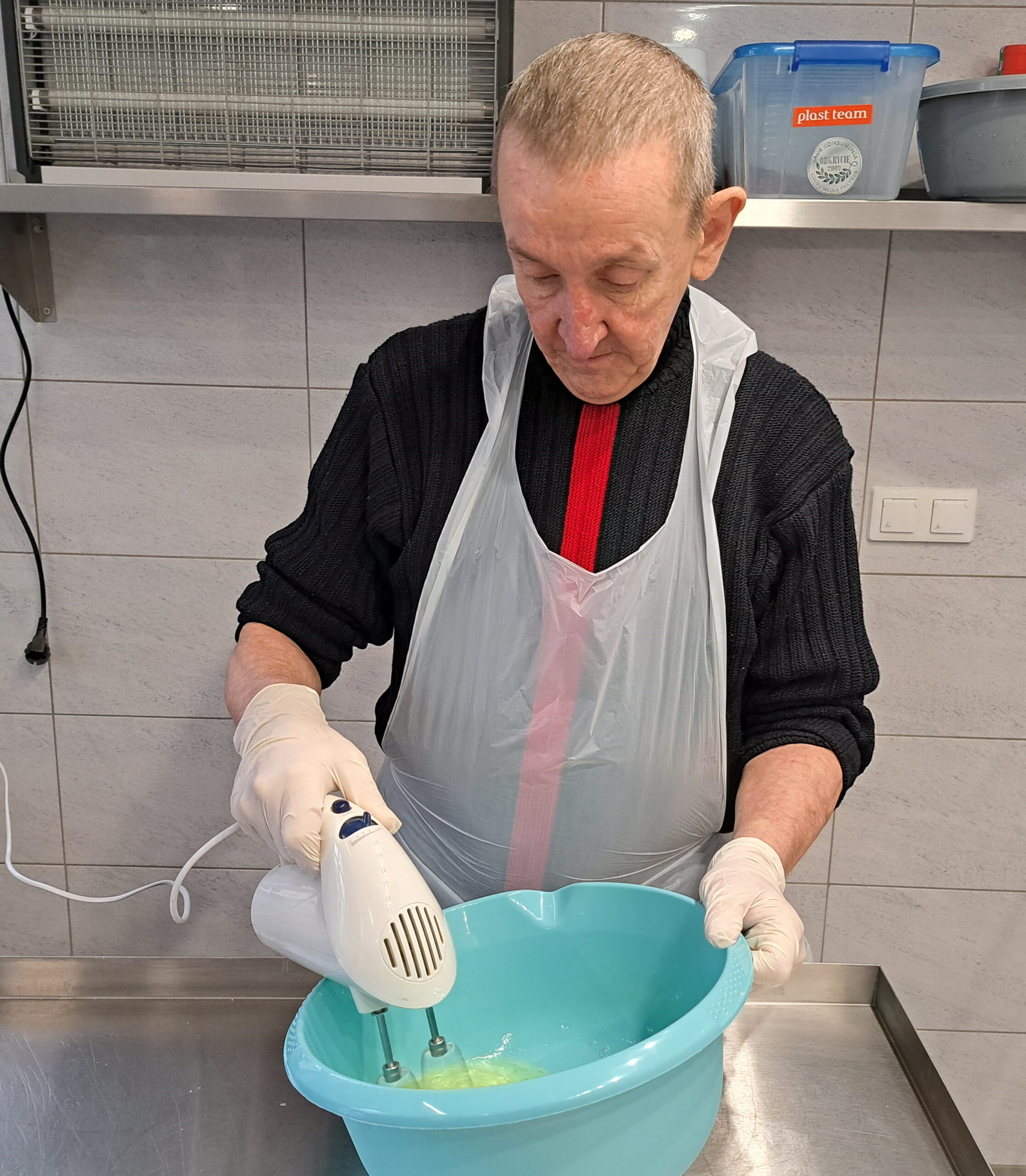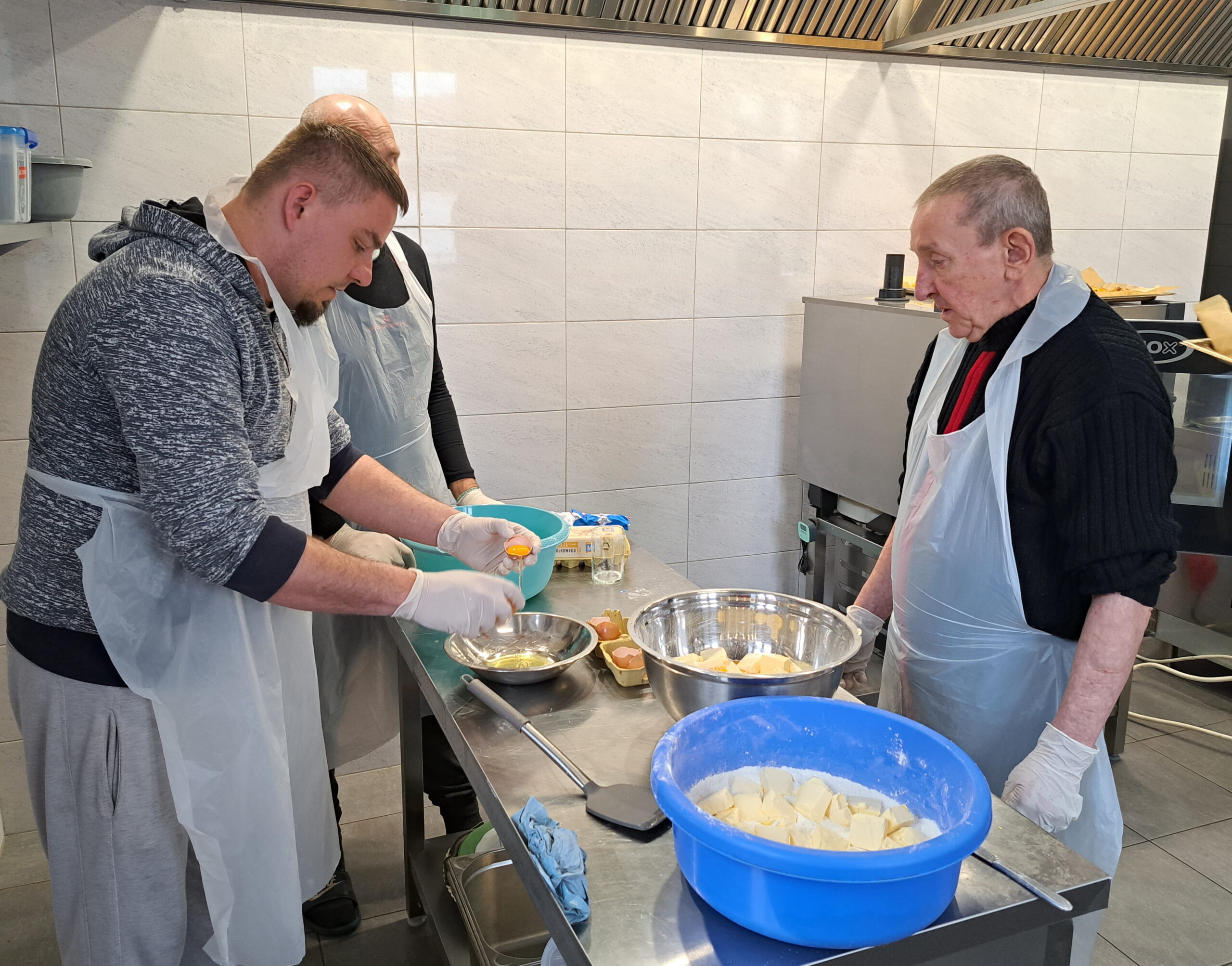 Panowie zdobywają kolejne umiejętności i zapoznają się z obsługą profesjonalnych sprzętów, które są wyposażeniem kuchni w Schronisku. Wiele satysfakcji przyniósł wszystkim efekt końcowy, gdy po upieczeniu można było z apetytem częstować się domowym ciastem.