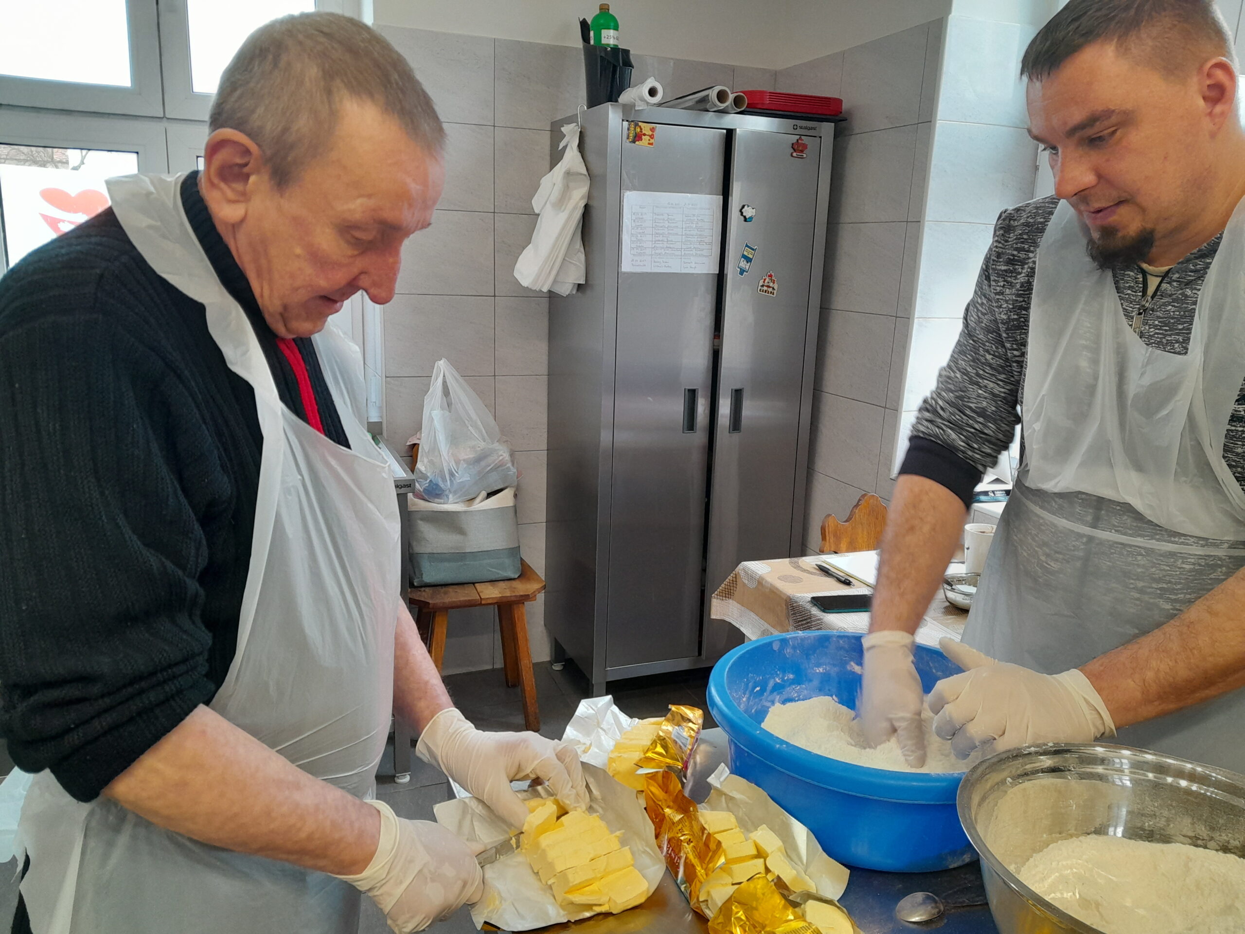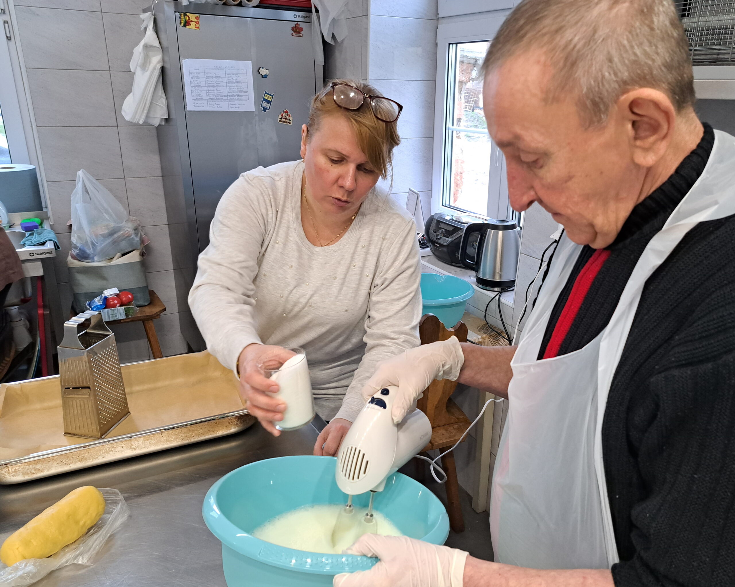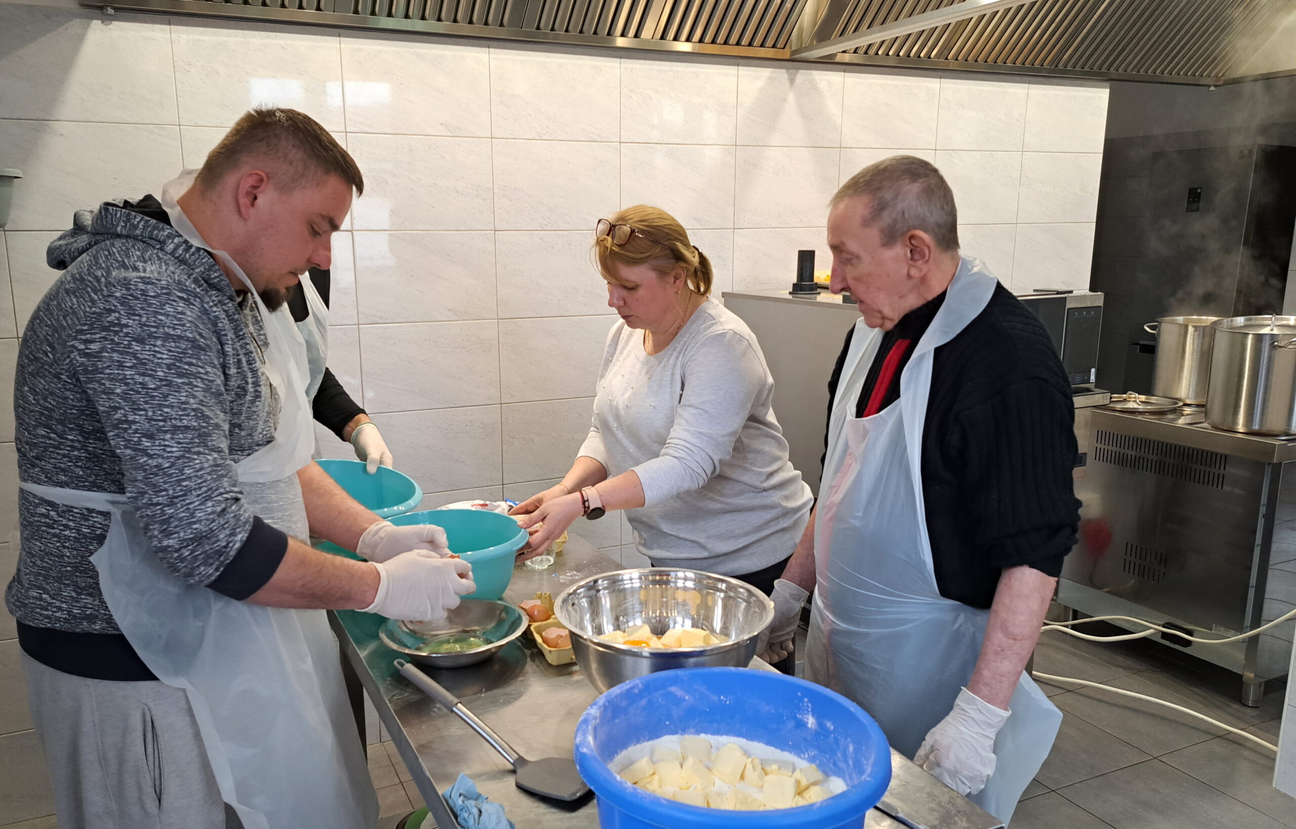 Panowie zdobywają kolejne umiejętności i zapoznają się z obsługą profesjonalnych sprzętów, które są wyposażeniem kuchni w Schronisku. Wiele satysfakcji przyniósł wszystkim efekt końcowy, gdy po upieczeniu można było z apetytem częstować się domowym ciastem.