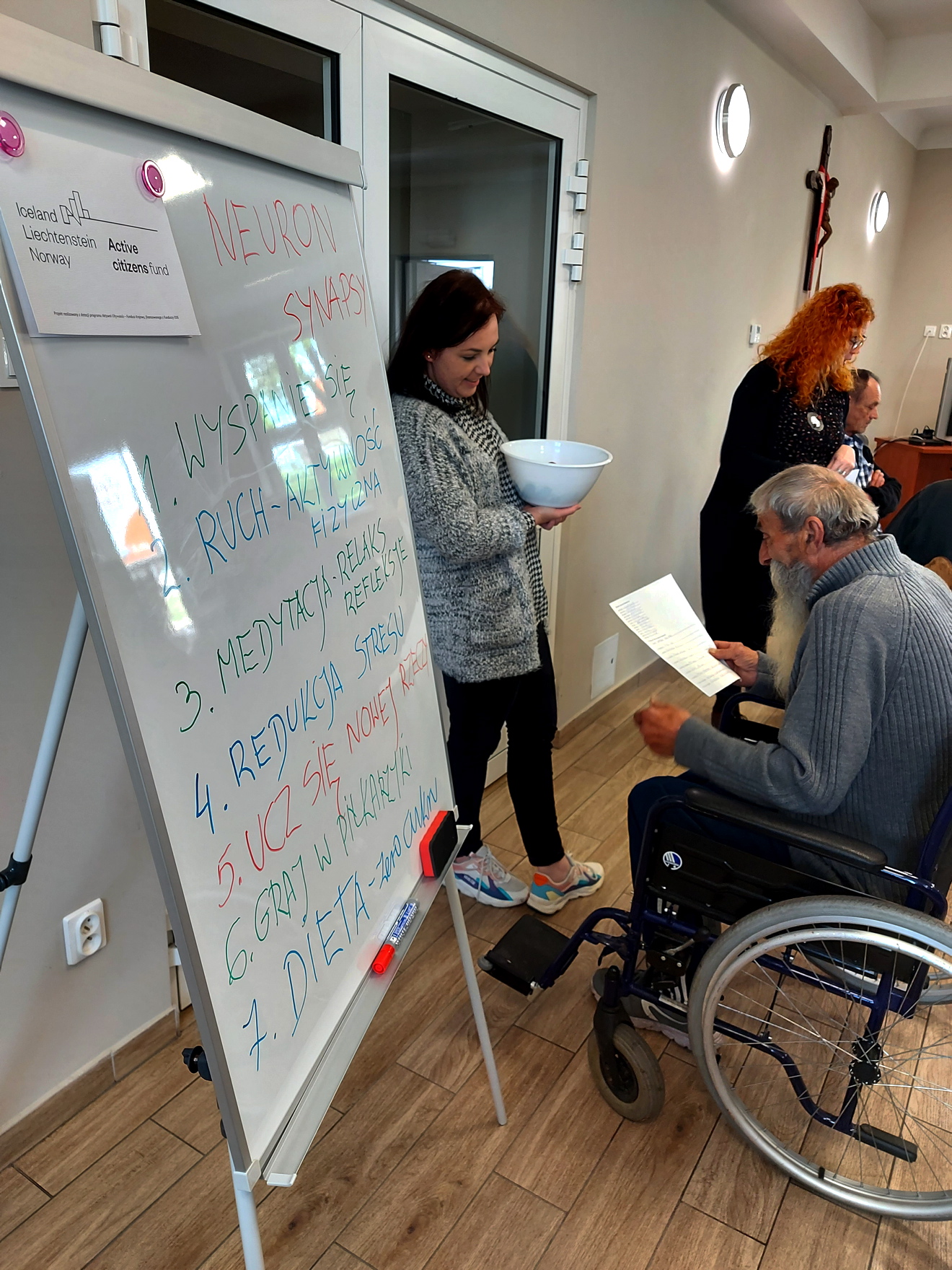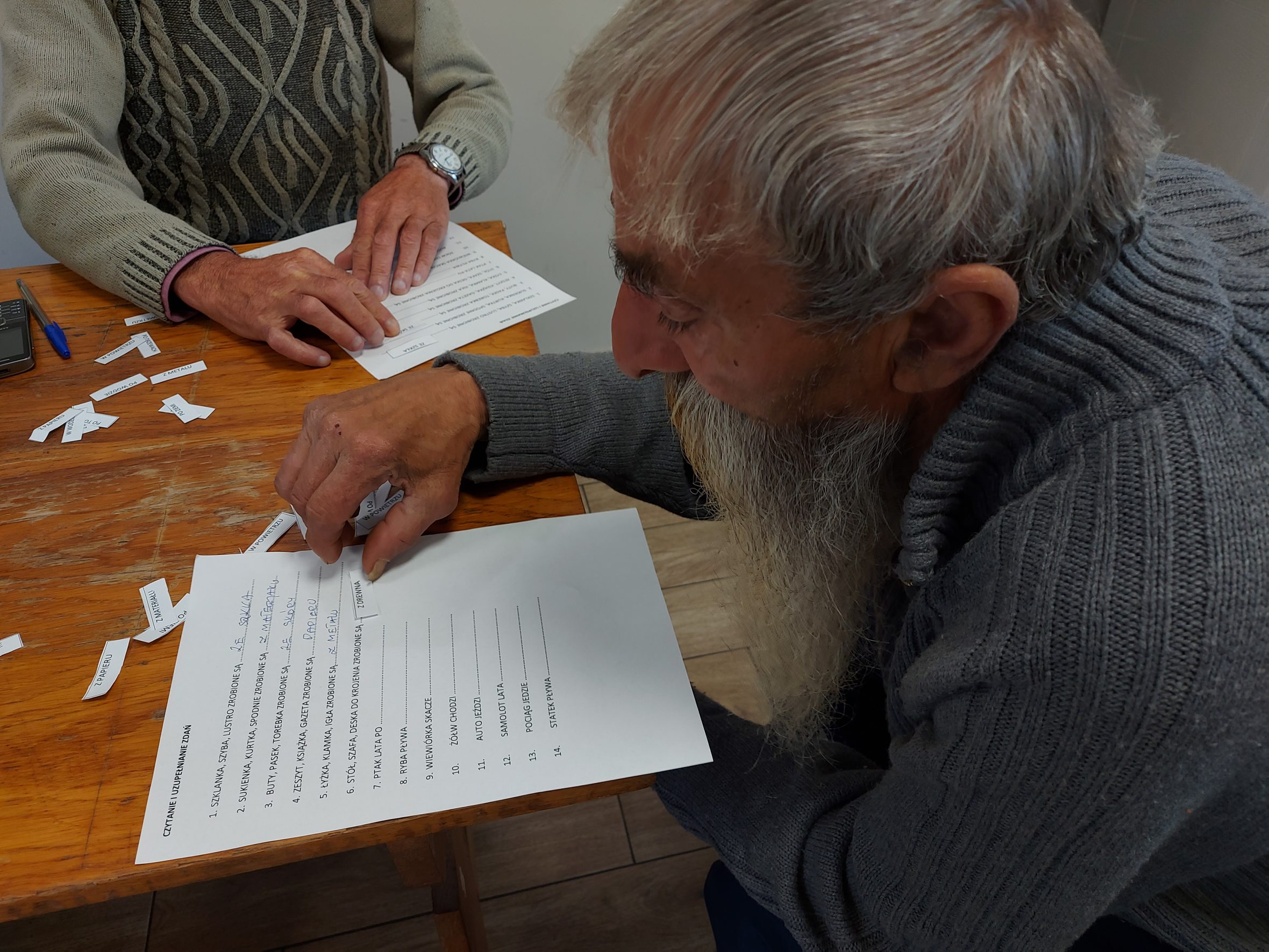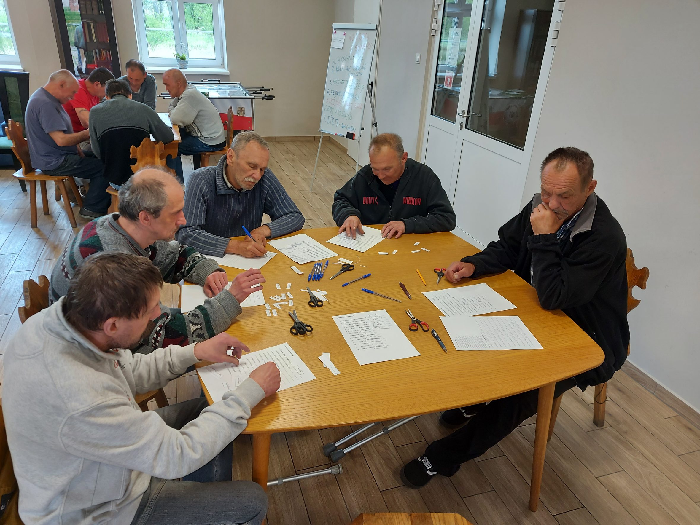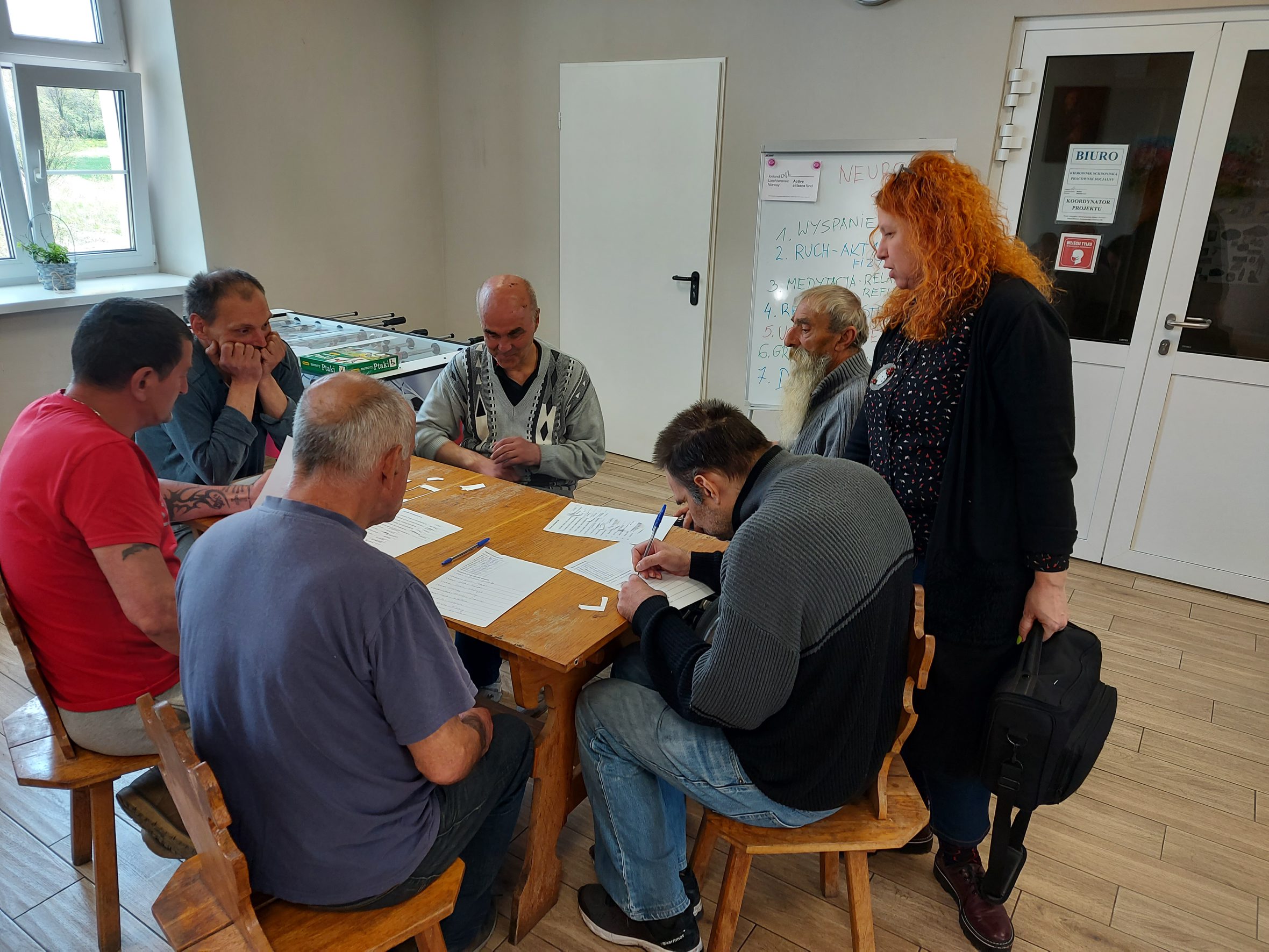 Oprócz wiadomości, jak istotne dla mózgu są: odpowiednia dieta, aktywność fizyczna, uczenie się nowych rzeczy czy radzenie sobie ze stresem, panowie w kolejnej części spotkania mieli także okazję sprawdzić jak działają i wzmocnić swoje procesy poznawcze. Bowiem przy pomocy wcześniej przygotowanych przez psychologa ćwiczeń pracowali chociażby nad poprawą swojej koncentracji, uwagi, orientacji w czasie czy tak ważnej pamięci. Jak ocenili sami panowie – spotkanie w takiej formie u wielu z nich przywołało dobre wspomnienia z czasów młodości, z beztroskich lat szkolnych, ale też były okazją, by przyswoić nowe informacje, opanować nowe umiejętności czy też zintegrować się z innymi mieszkańcami schroniska.