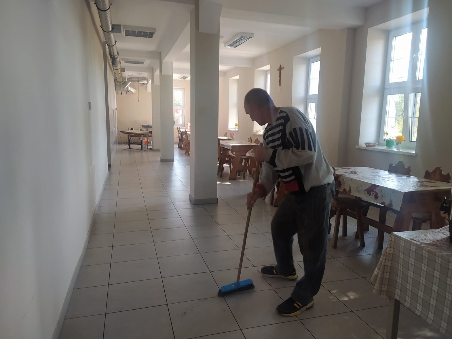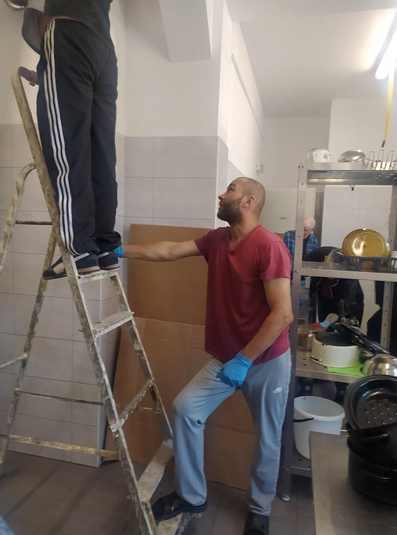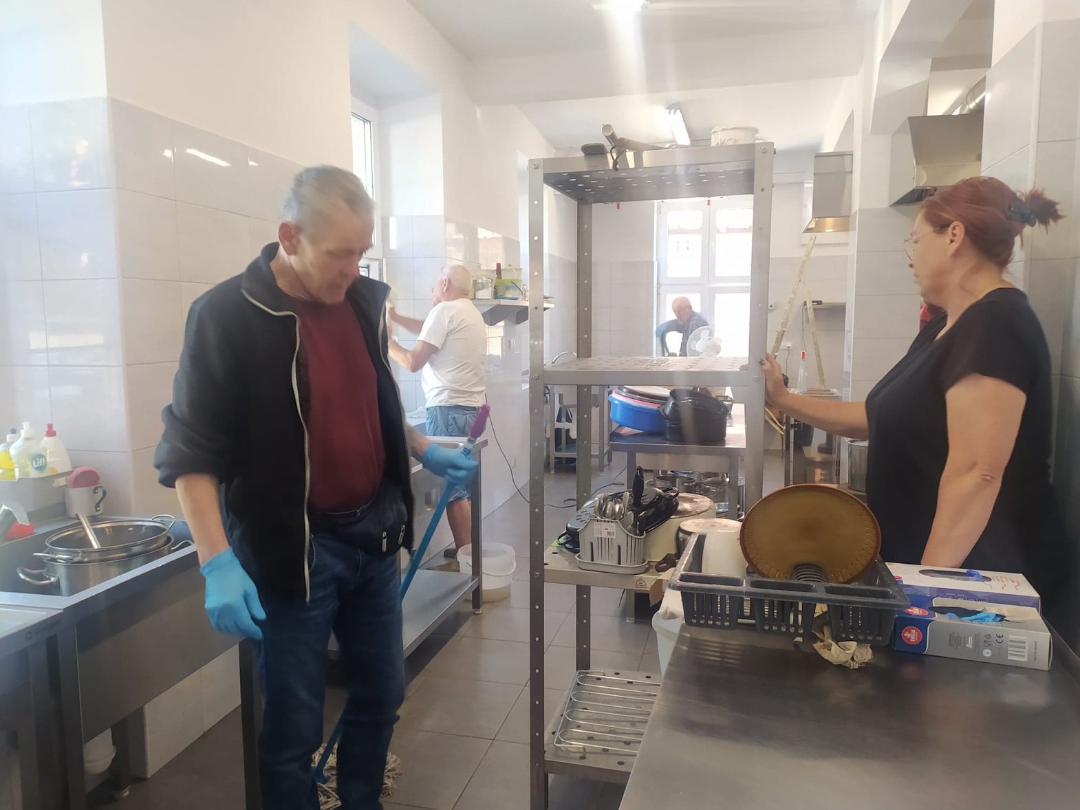 Panowie podczas cyklicznych szkoleń robią generalne porządki w pomieszczeniach kuchennych oraz około kuchennych. Dzisiaj każdy z Mieszkańców na miarę swoich możliwości podjął się zadania, które zostało wyznaczone przez Panią Coach. Każdy z Mieszkańców ma swój wkład w pracach kuchennych.