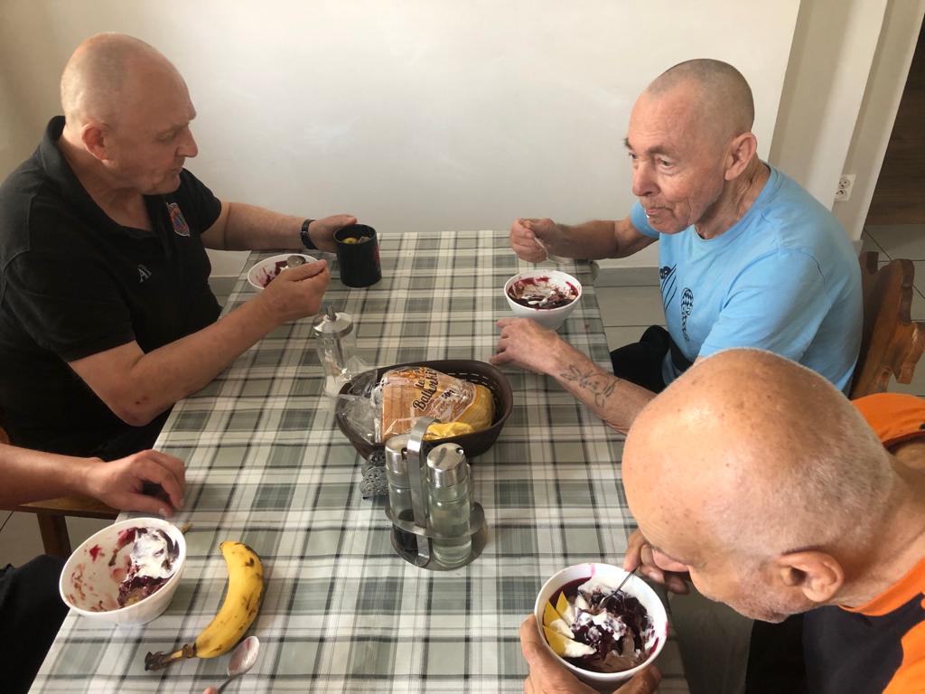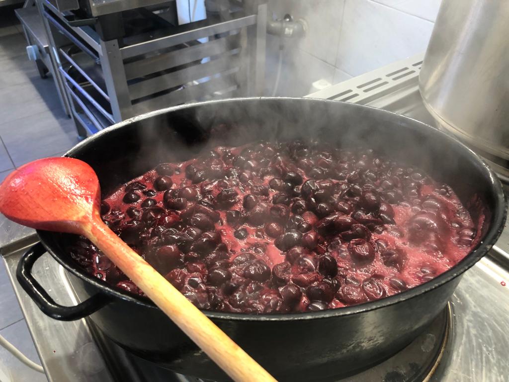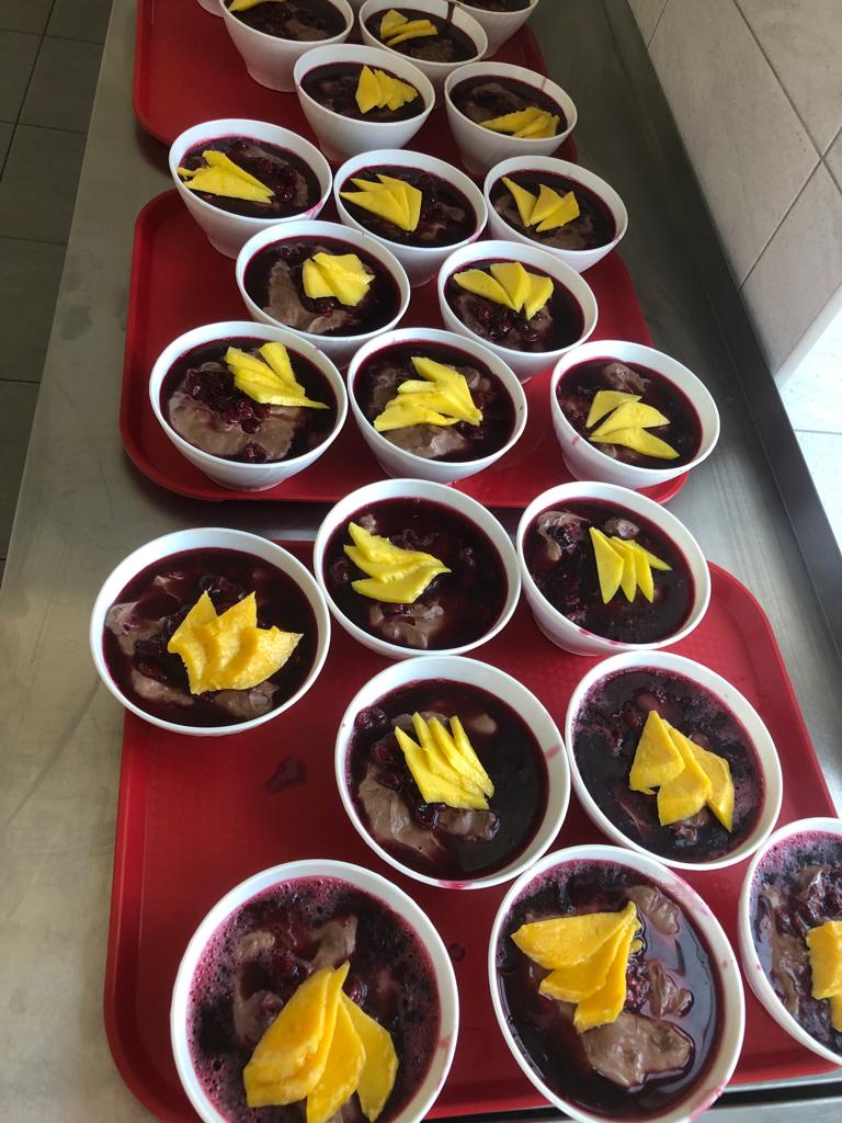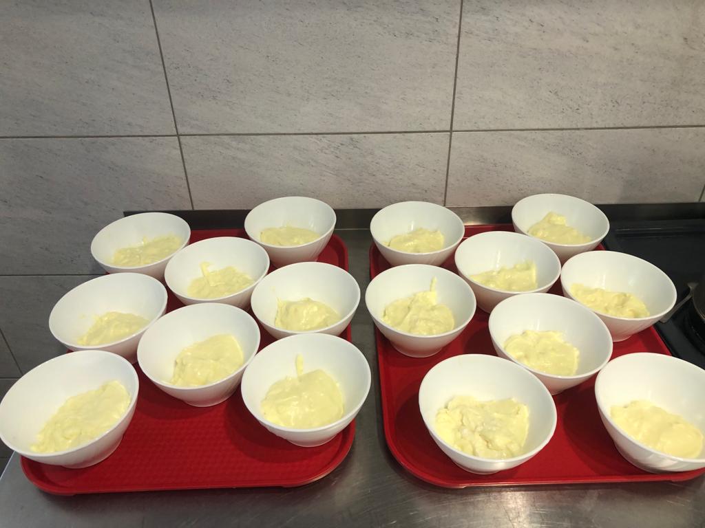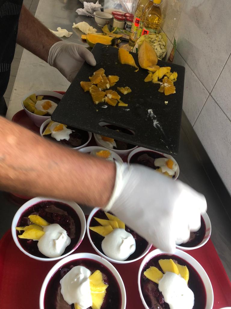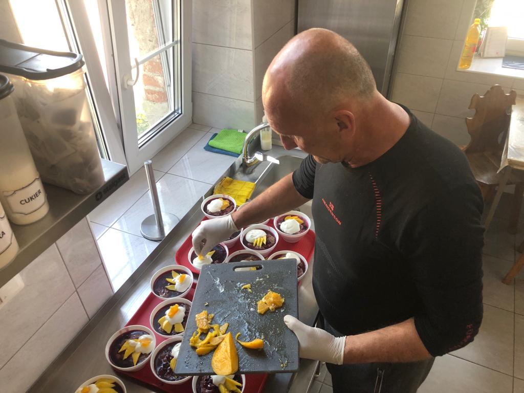 Mieszkańcy Schroniska zadbali o przygotowanie deseru budyniowego z owocami świeżych wiśni i z bitą śmietaną. Mieszkańcy próbują swoich sił w kuchni, mają szansę rozwijać swoje umiejętności. Panowie angażując się do pracy w kuchni zapewniają miłe niespodzianki współmieszkańcom oraz doskonalą swoje przepisy.