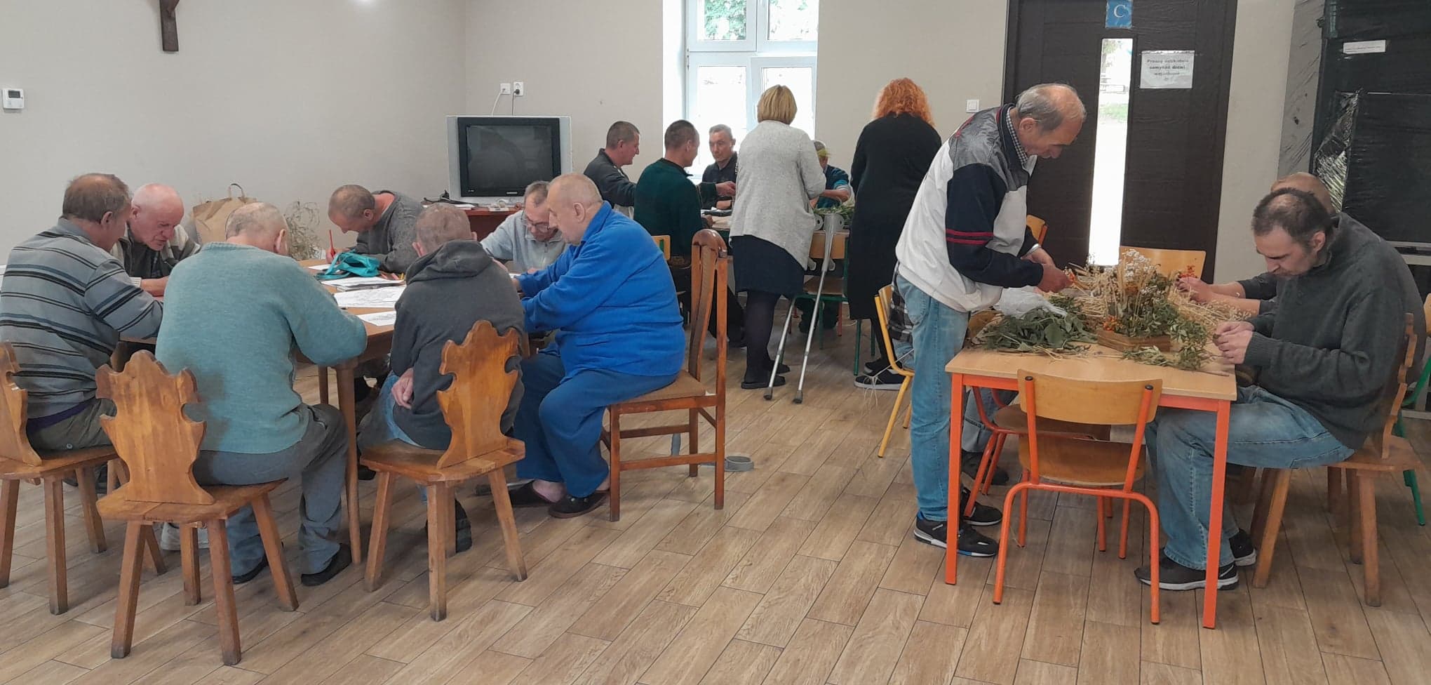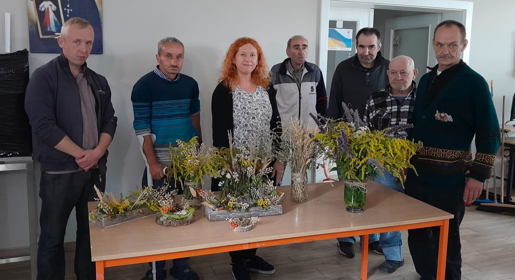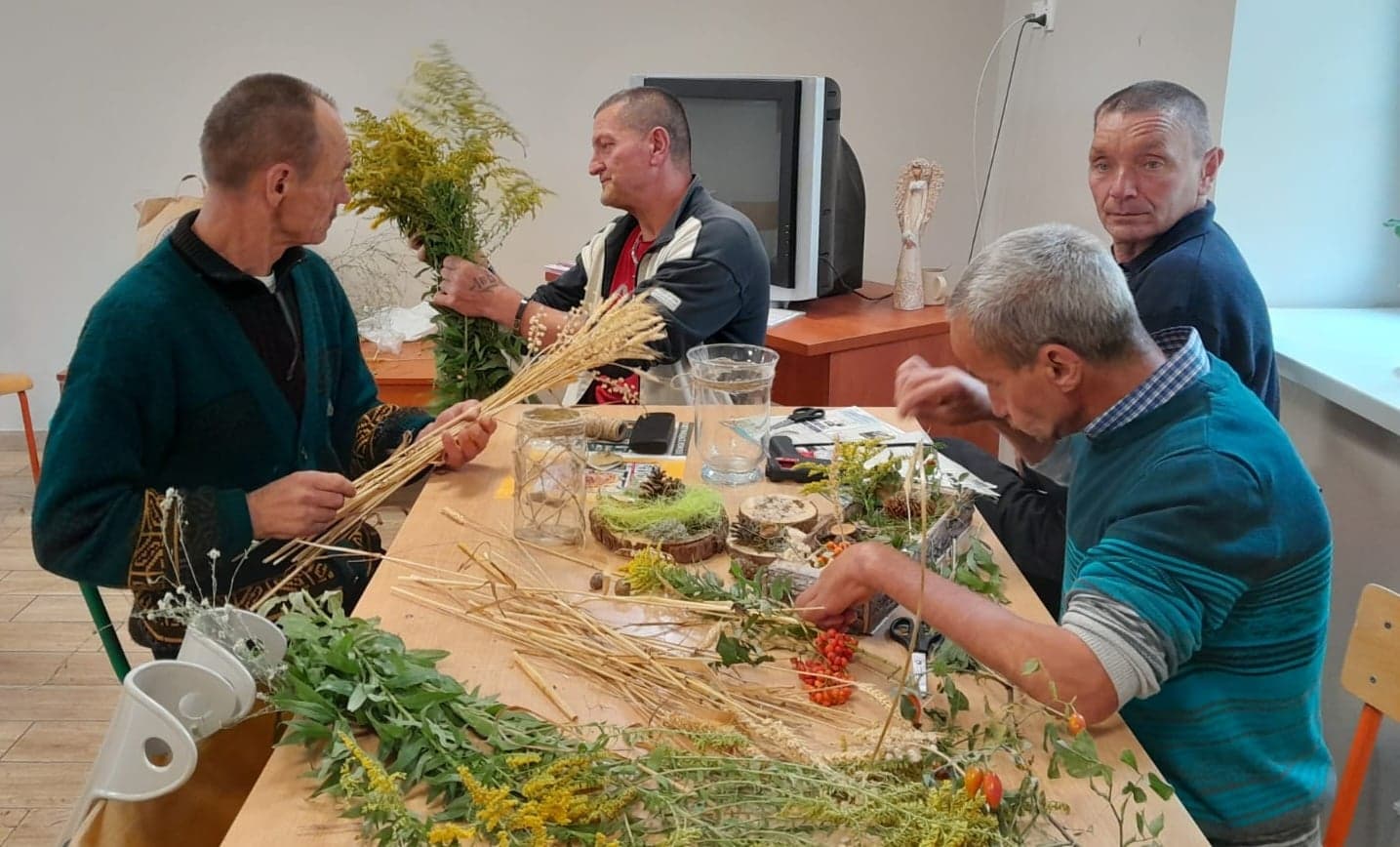 Dnia 16.09. odbyło się w Żukowicach spotkanie z wykorzystaniem arteterapii oraz elementów hortiterapii. Podopieczni Ośrodka podzieleni zostali na dwie grupy – jedni oddali się kreatywnym pracom z wykorzystaniem roślin, a pozostali kolorowali obrazki przedstawiające piękno natury. Zajęcia miały również na celu stymulację zmysłów, które mają ogromny wpływ na kondycję psychiczną człowieka. Ważne jest to, że podczas zajęć z roślinami, na skutek kontaktu z przyrodą obserwuje się wydzielanie tak ważnego neuroprzekaźnika, jak serotonina, która jest odpowiedzialna za nasz dobry nastrój. I faktycznie- najpierw podczas gromadzenia potrzebnych do zajęć roślin, a następnie podczas tworzenia jesiennych dekoracji, które ozdabiają już pomieszczenia w Ośrodku – zauważyć można było pozytywny nastrój u wielu uczestników zajęć.