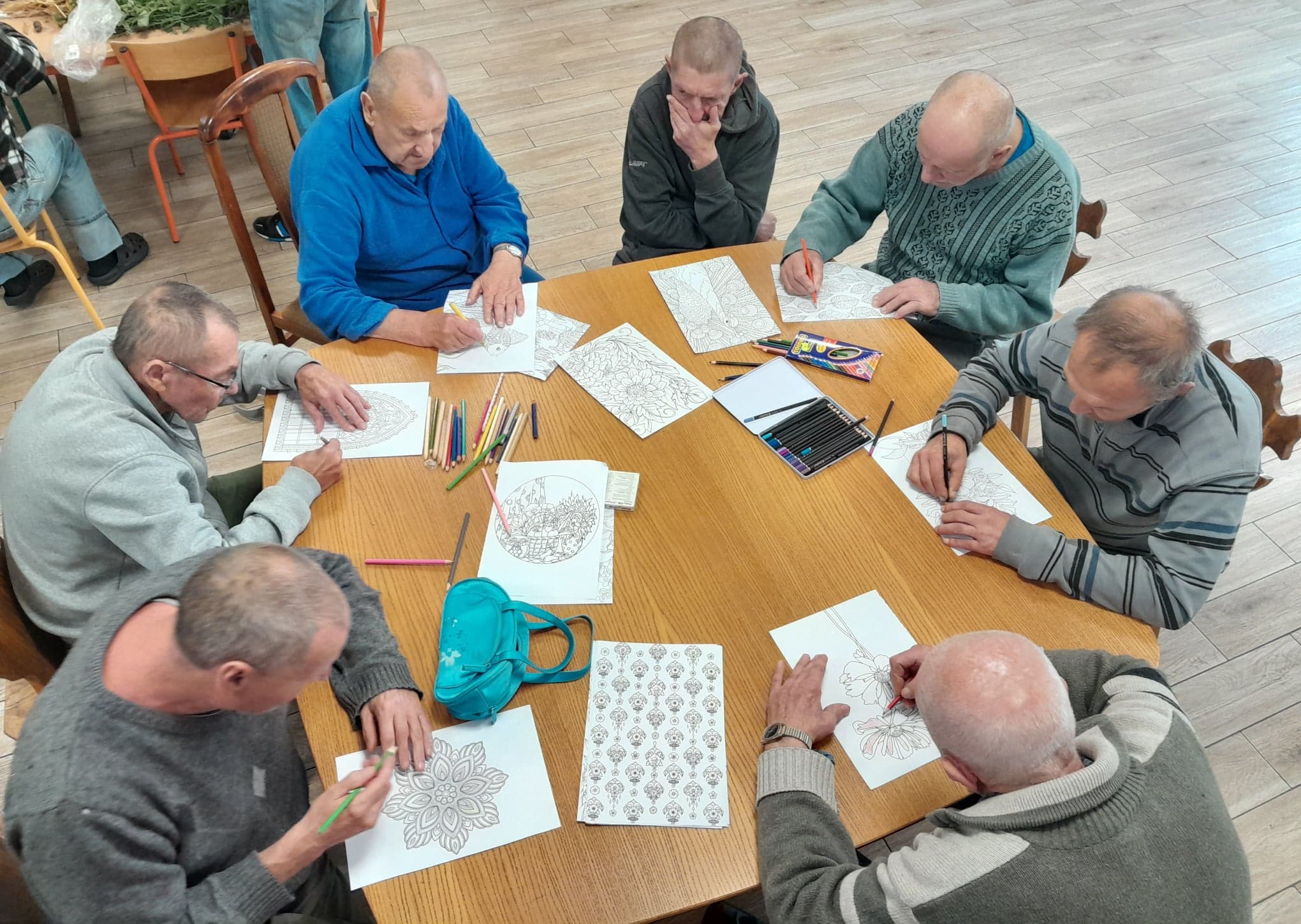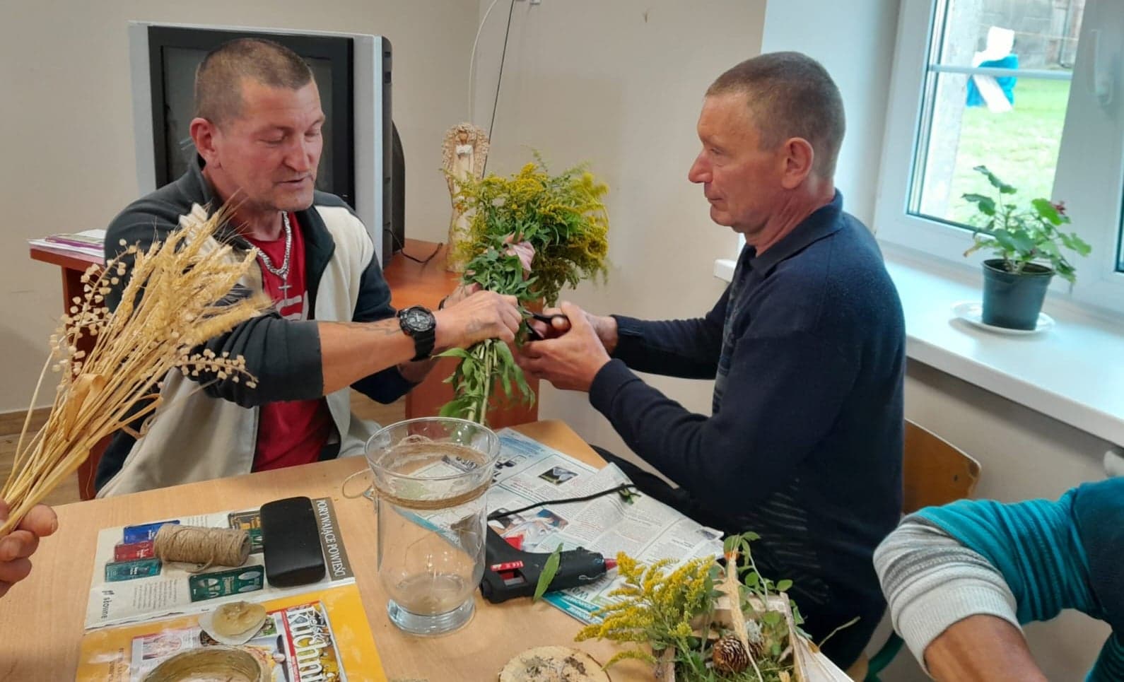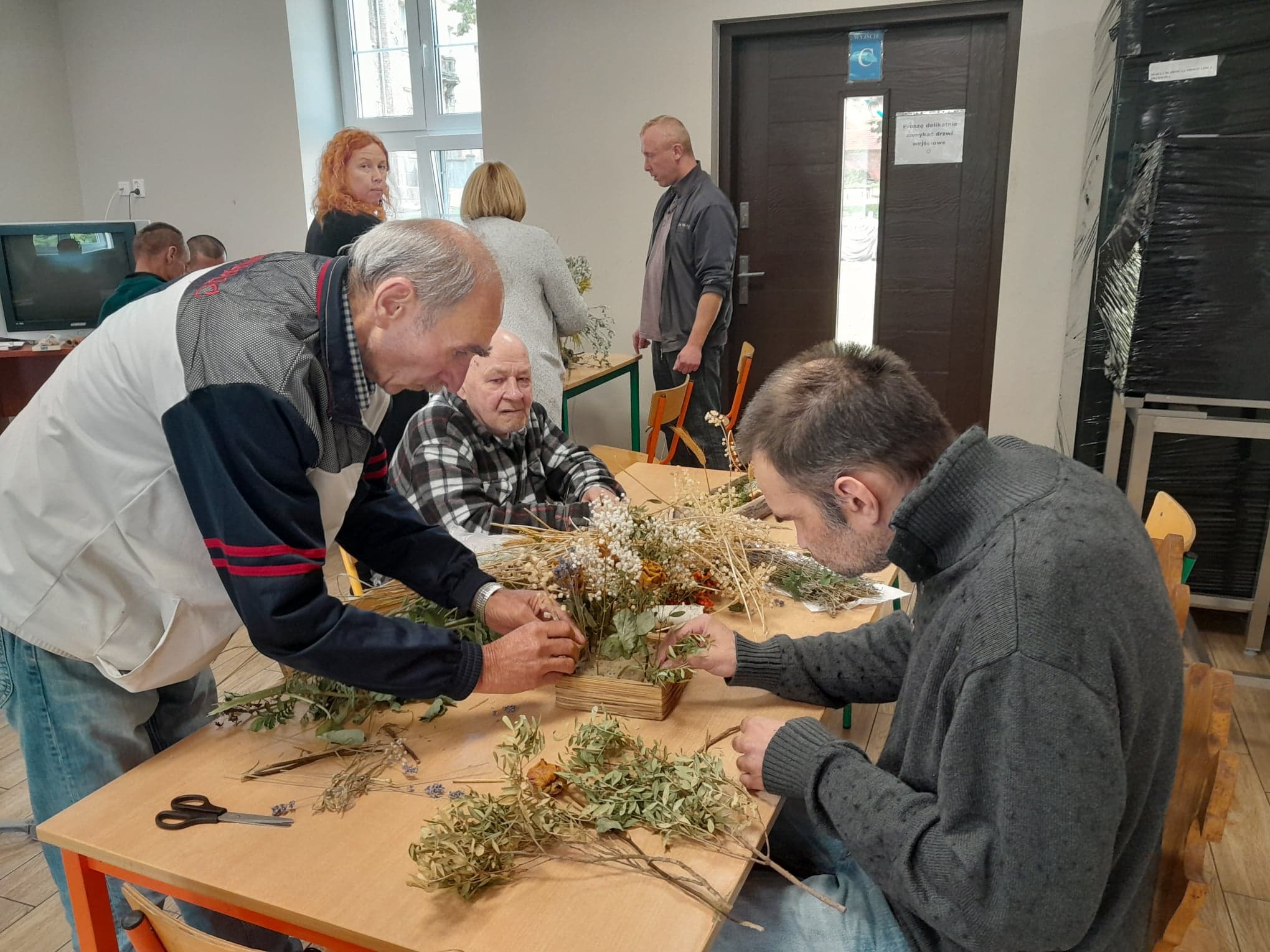 Dnia 16.09. odbyło się w Żukowicach spotkanie z wykorzystaniem arteterapii oraz elementów hortiterapii. Podopieczni Ośrodka podzieleni zostali na dwie grupy – jedni oddali się kreatywnym pracom z wykorzystaniem roślin, a pozostali kolorowali obrazki przedstawiające piękno natury. Zajęcia miały również na celu stymulację zmysłów, które mają ogromny wpływ na kondycję psychiczną człowieka. Ważne jest to, że podczas zajęć z roślinami, na skutek kontaktu z przyrodą obserwuje się wydzielanie tak ważnego neuroprzekaźnika, jak serotonina, która jest odpowiedzialna za nasz dobry nastrój. I faktycznie- najpierw podczas gromadzenia potrzebnych do zajęć roślin, a następnie podczas tworzenia jesiennych dekoracji, które ozdabiają już pomieszczenia w Ośrodku – zauważyć można było pozytywny nastrój u wielu uczestników zajęć.