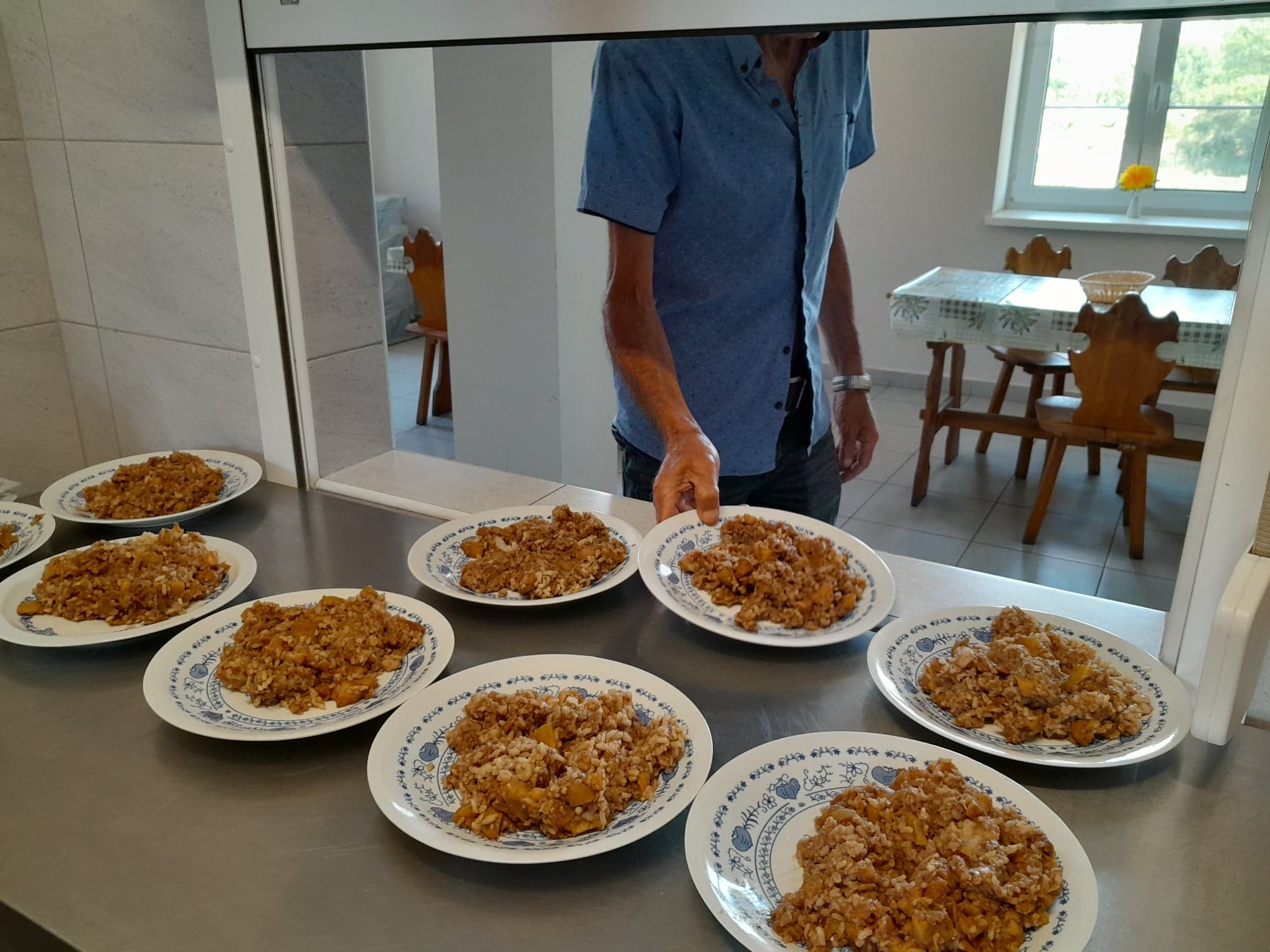 Panowie przygotowywali ryż z jabłkami, jako drugie danie obiadowe. Pani Couch sporządziła podział zadań, by praca była sprawna i przyjemna. Do tych zadań należała obróbka wstępna – mycie, obieranie i krojenie owoców. Następnie Panowie smażyli owoce, gotowali ryż i przygotowywali do podania, a w międzyczasie inne osoby sprzątały po wspólnej pracy.