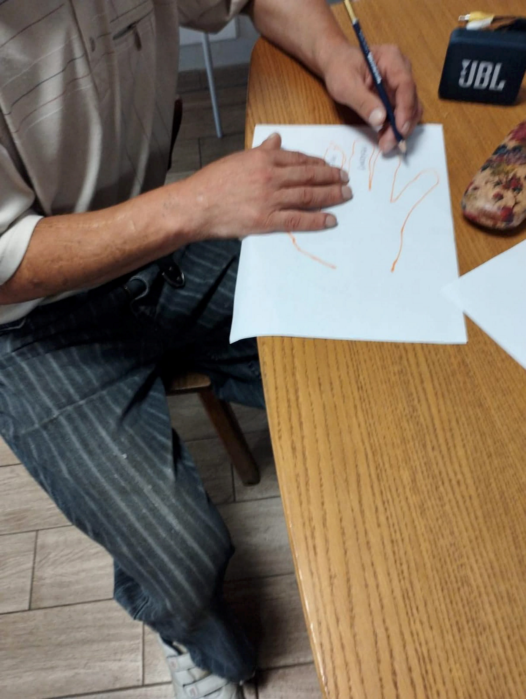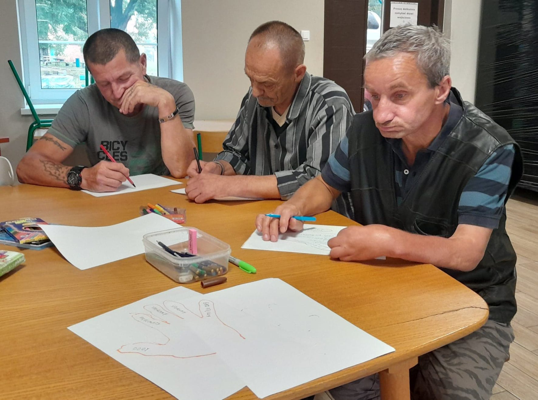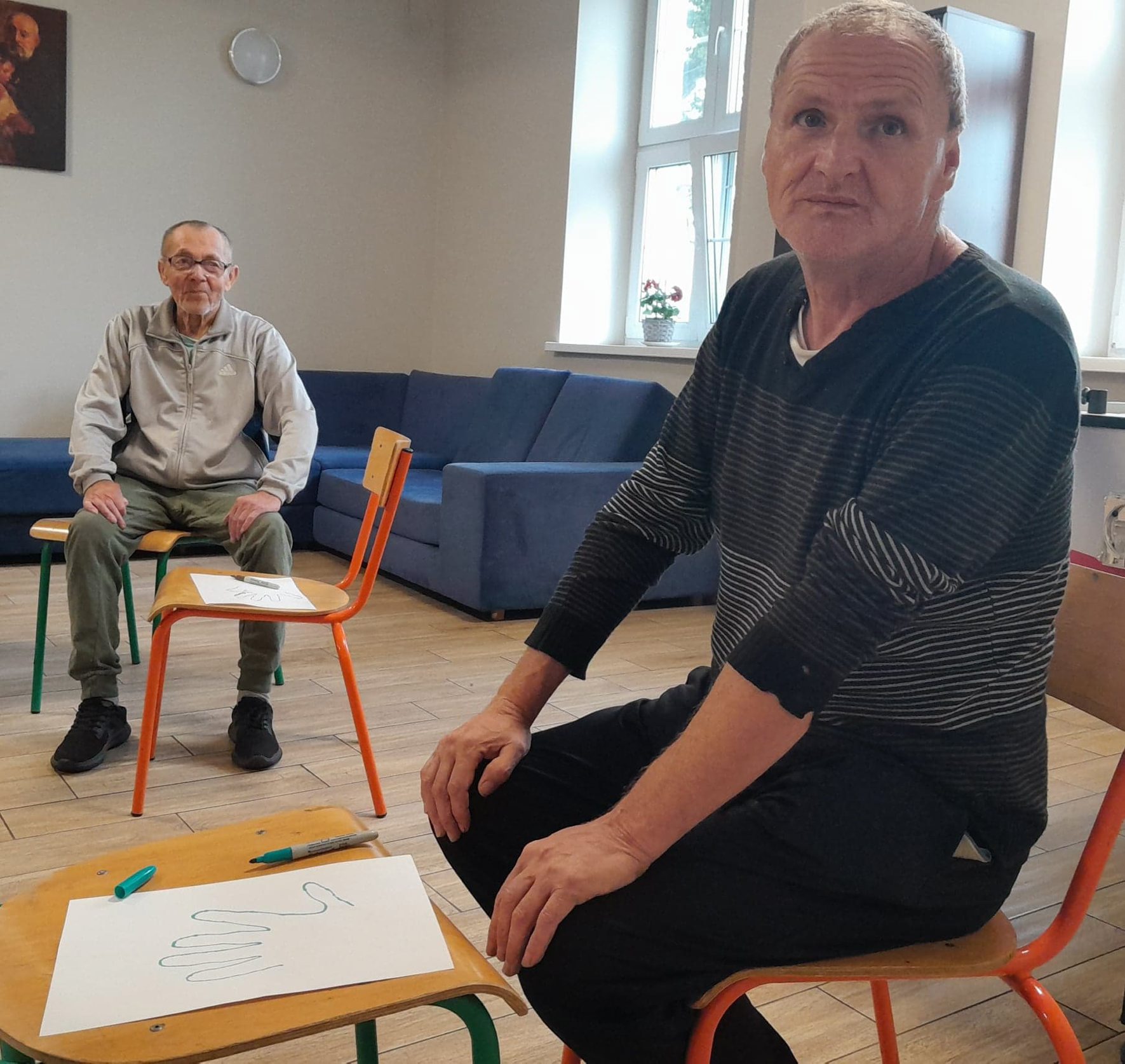 We wtorek 23 sierpnia podopieczni Schroniska zostali zaproszeni na kolejne zajęcia psychoterapeutyczne. Spotkanie rozpoczęło się od indywidualnego zadania, gdyż każdy odrysowywał swoją dłoń, a następnie na jej palcach wypisywał swoje cechy. Następnym zadaniem było przedstawienie grupie swojego rysunku i opowiedzenie o sobie. Niektórzy z uczestników byli bardzo krytyczni wobec siebie i wtedy grupa pomagała znaleźć jakieś pozytywne cechy osobowości – tak, aby każdy miał świadomość, że ma w sobie coś wartościowego.