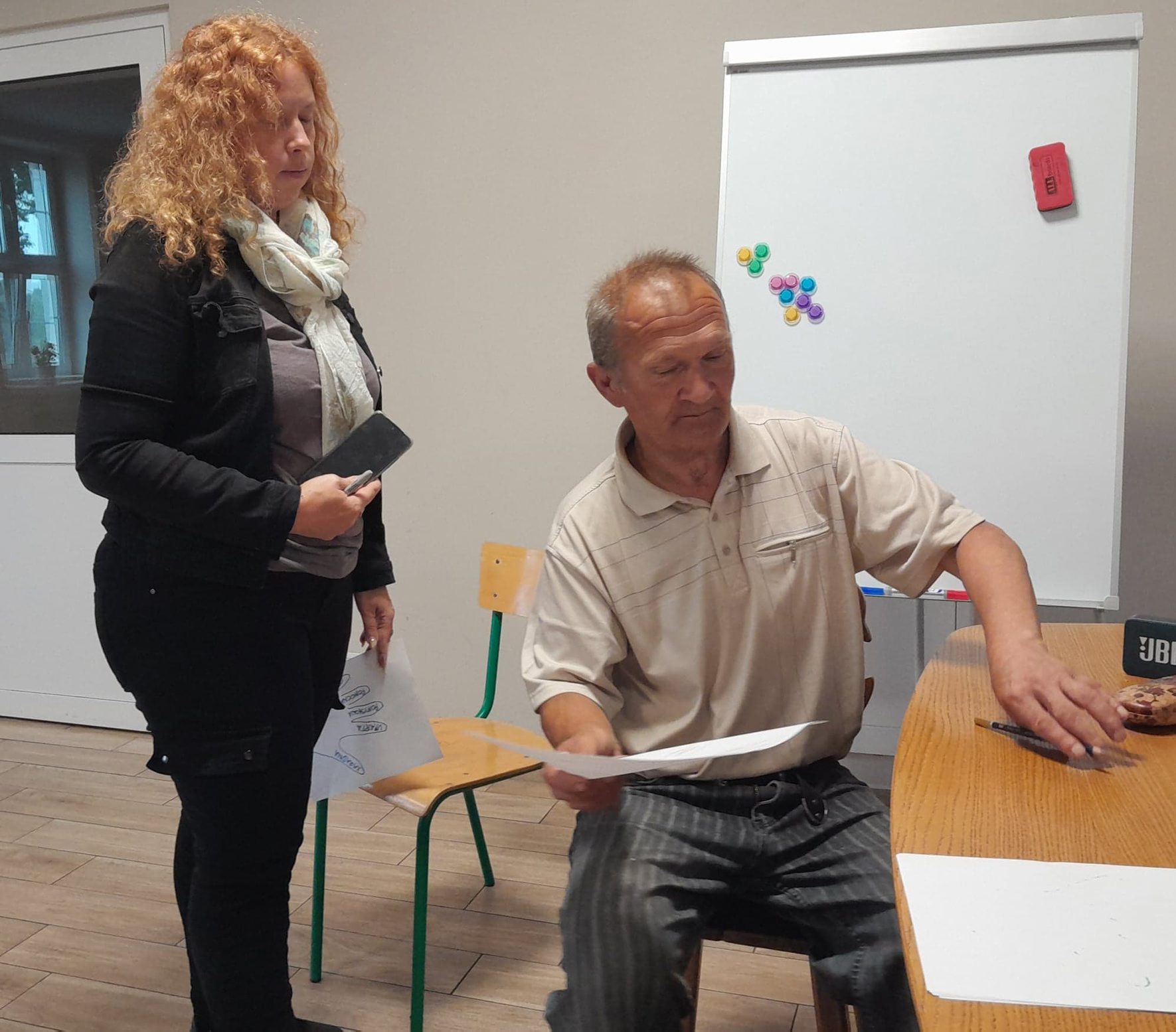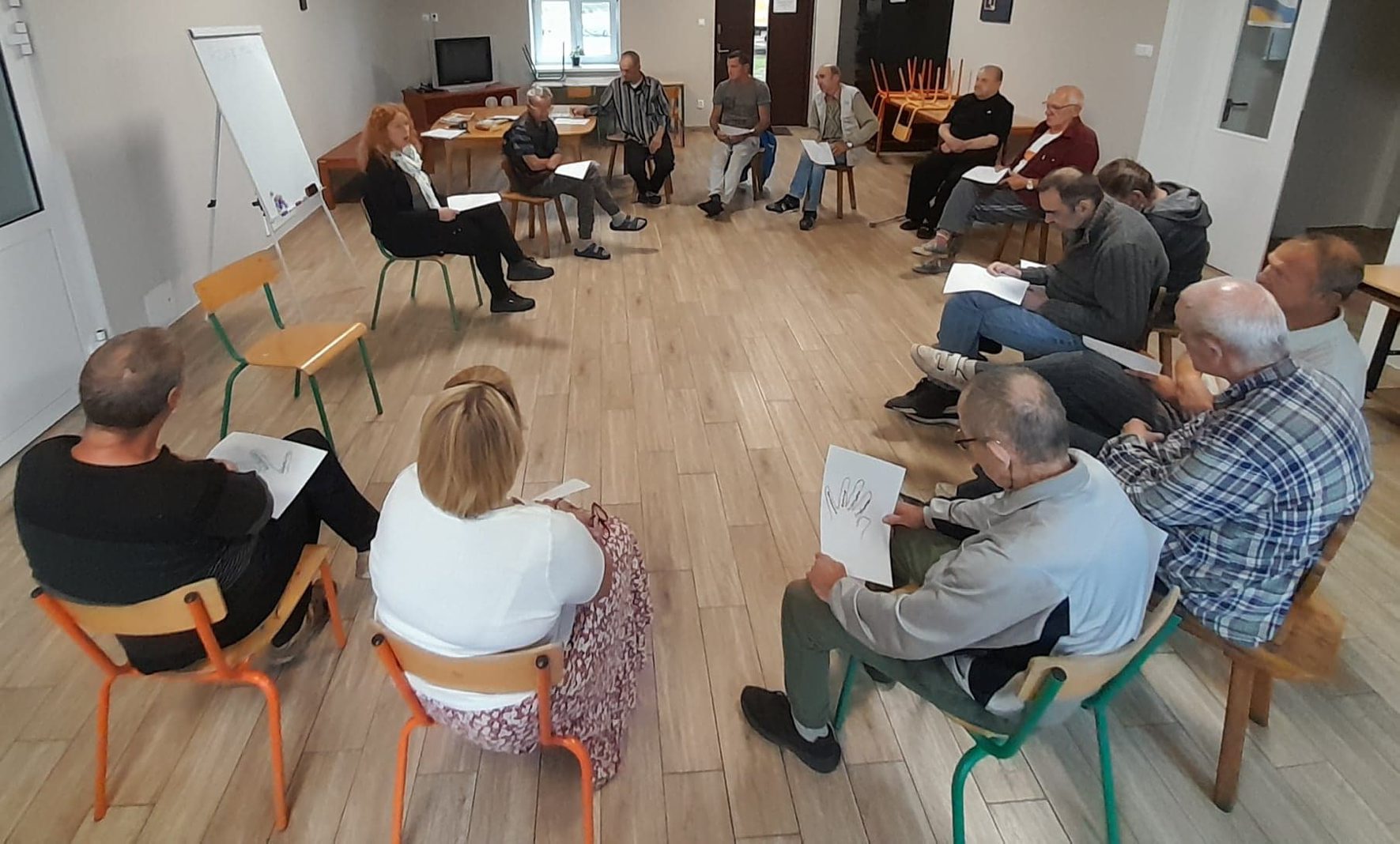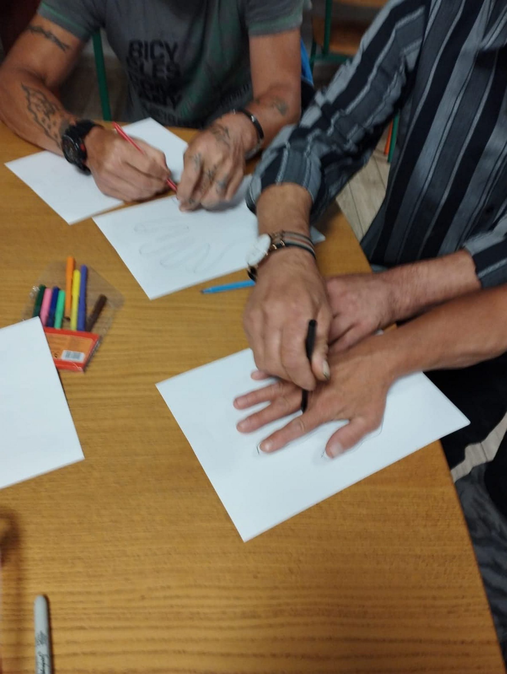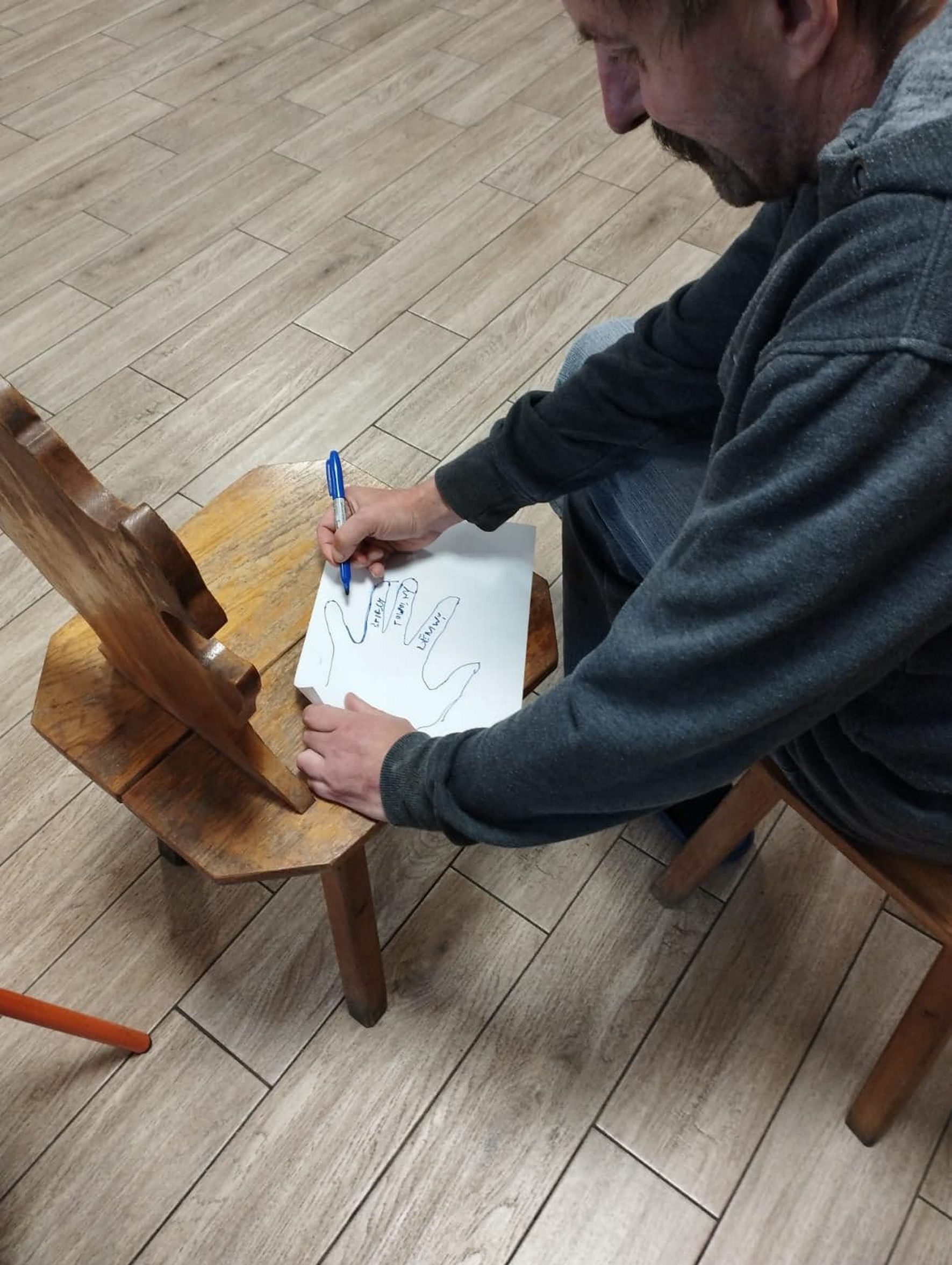 We wtorek 23 sierpnia podopieczni Schroniska zostali zaproszeni na kolejne zajęcia psychoterapeutyczne. Spotkanie rozpoczęło się od indywidualnego zadania, gdyż każdy odrysowywał swoją dłoń, a następnie na jej palcach wypisywał swoje cechy. Następnym zadaniem było przedstawienie grupie swojego rysunku i opowiedzenie o sobie. Niektórzy z uczestników byli bardzo krytyczni wobec siebie i wtedy grupa pomagała znaleźć jakieś pozytywne cechy osobowości – tak, aby każdy miał świadomość, że ma w sobie coś wartościowego.